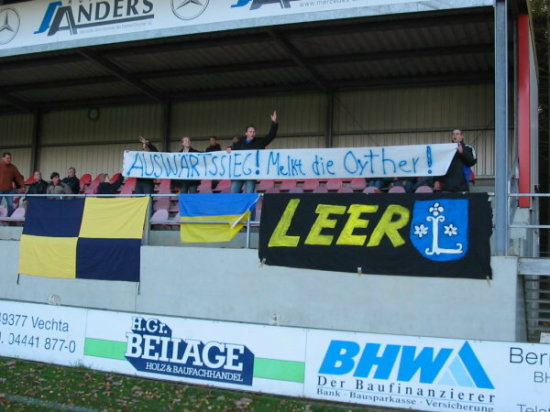 Aber auch von Seiten der Fans insbesondere der Basis Leer wurde so einiges auf die Beine gestellt. Unter der Woche wurden u.a. ein Spruchband "Verneigt euer Haupt vor dem Meister" und zwei große blau-gelbe Schwenkfahnen angefertigt, die den Support auch optisch unterstreichen sollten.