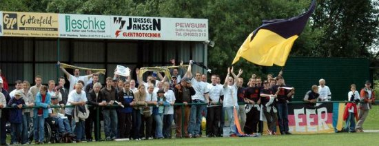 Nachdem die Zaunfahnen angebracht waren und sich alle im Germania-Block versammelt hatten, fiel dem Fanbeauftragten Holger Buss ein, dass nun noch die Germania-Hymne fehlte. Also marschierte Bussi direkt zum Stadionsprecher und gab ihm eine CD mit der Hymne. Wenige Minuten darauf ertönte das Germania-Vereinslied im Pewsumer Stadion. Es herrschte Heimspielatmosphäre! Überhaupt hatte man den Eindruck, dass sich niemand wirklich um den TuS Pewsum gekümmert hat. Alles blickte auf den VfL Germania Leer.